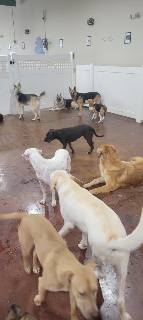 Vaccinations required: Rabies, DHPP, Bordetella. Group play and individual care available. Full-service grooming and live webcams.
